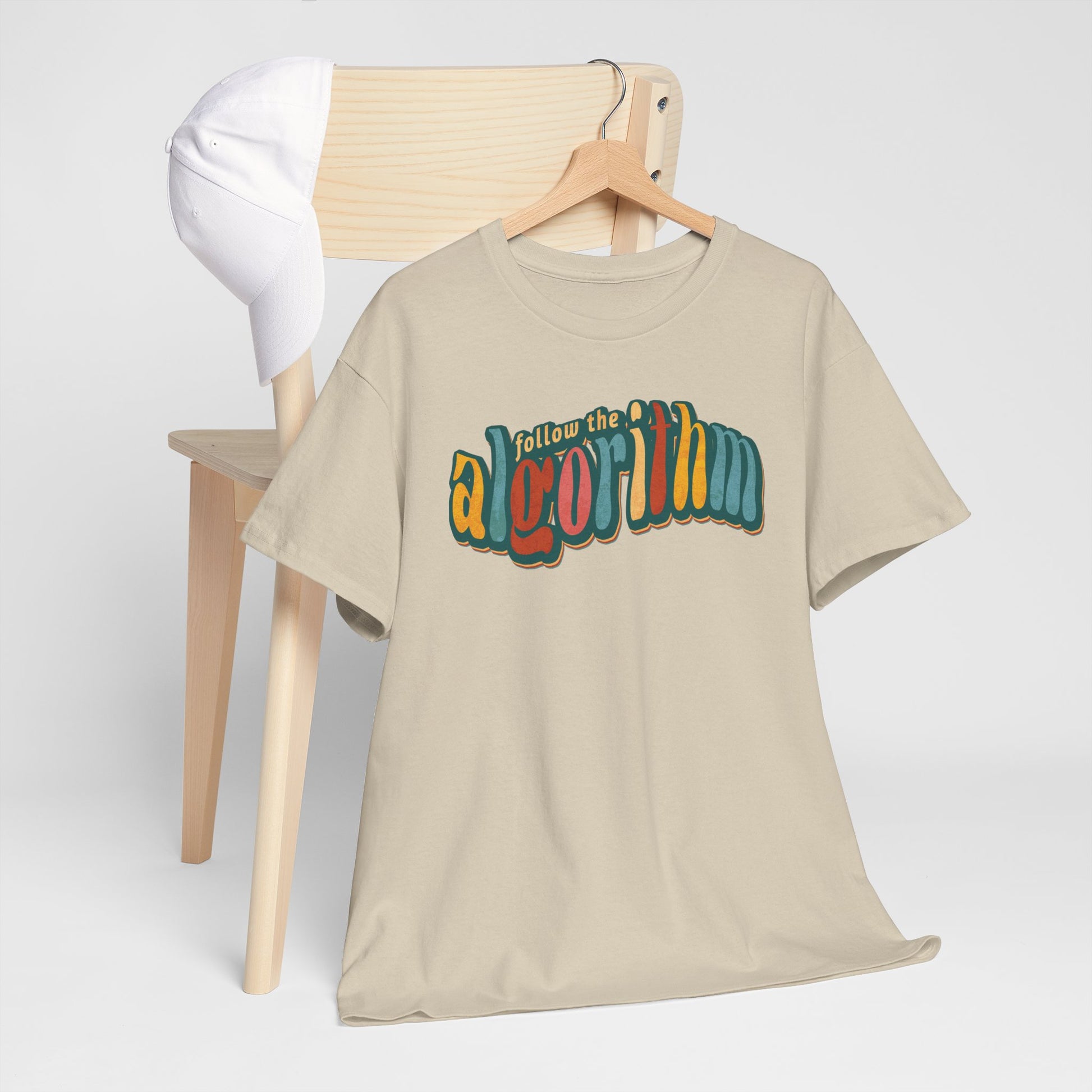 Be the cool cat bringing the code this fall! A colorful 'Follow the Algorithm' grooves across your Tee in nature-inspired reds, yellows, and blues. Your closet will be jazzed to welcome this comfortable, unisex shirt. The print is gently distressed for that casual throwback look. This medium weight, 100% cotton tee is easy to wear and an instant favorite.