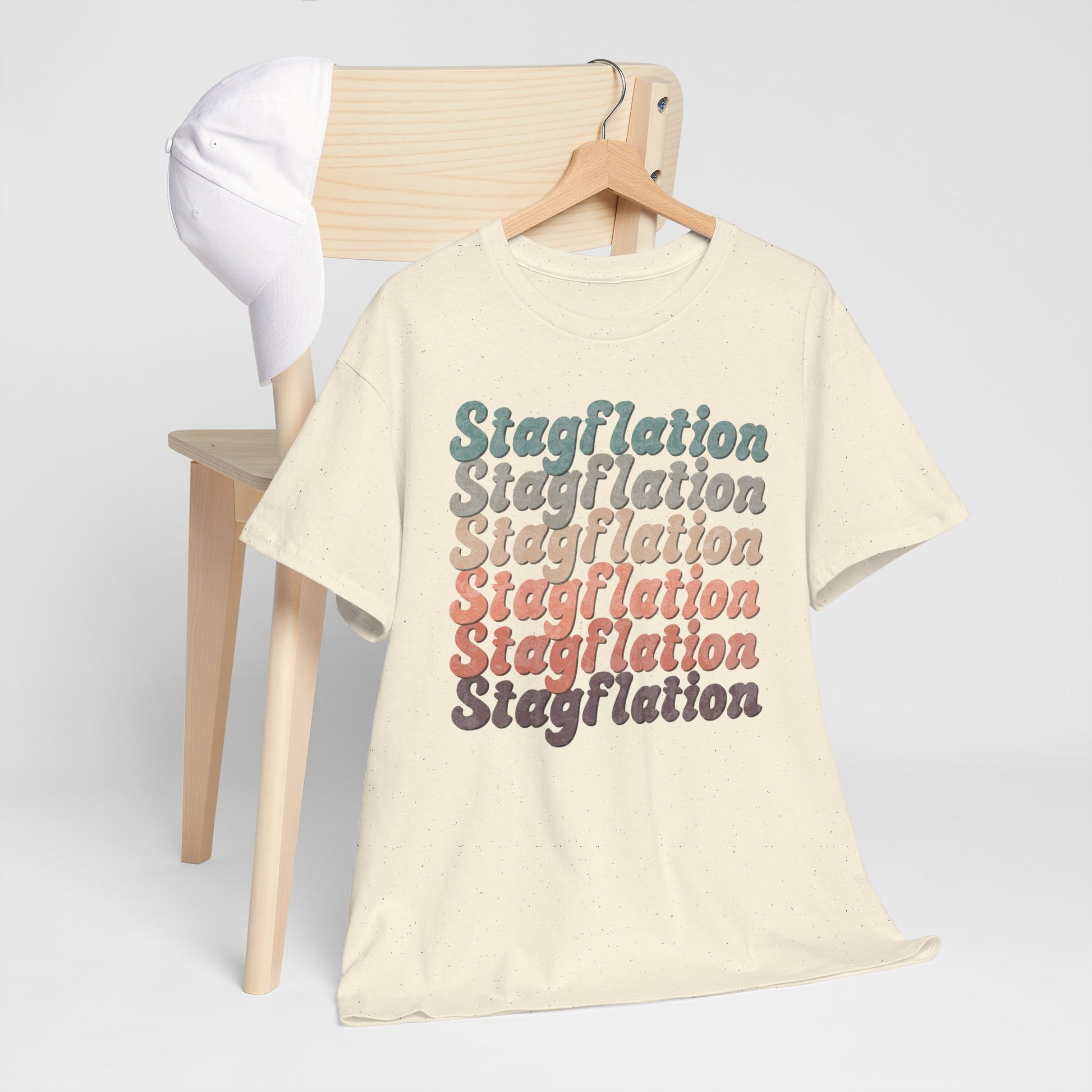 A fringed jacket and a 'fiver' in your wallet? Snaps for keepin' it real. Let's chant 'Stagflation' together as it marches down your Tee in earthy blues and oranges. Your wardrobe will be stoked to welcome this comfortable, unisex shirt. The print is gently distressed for that casual throwback look. This medium weight, 100% cotton tee is a far out look on everyone.