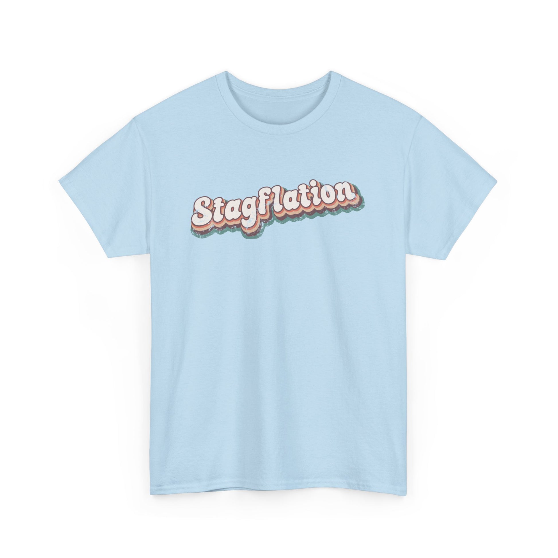 Grab your platform shoes and call it like you see it! A sassy 'Stagflation' angles across your Tee in earthy blues and oranges. Your wardrobe will go bananas when this comfortable, unisex shirt comes to stay. The print is gently distressed for that casual throwback look. This slammin', medium weight, 100% cotton tee wears well on everyone.
