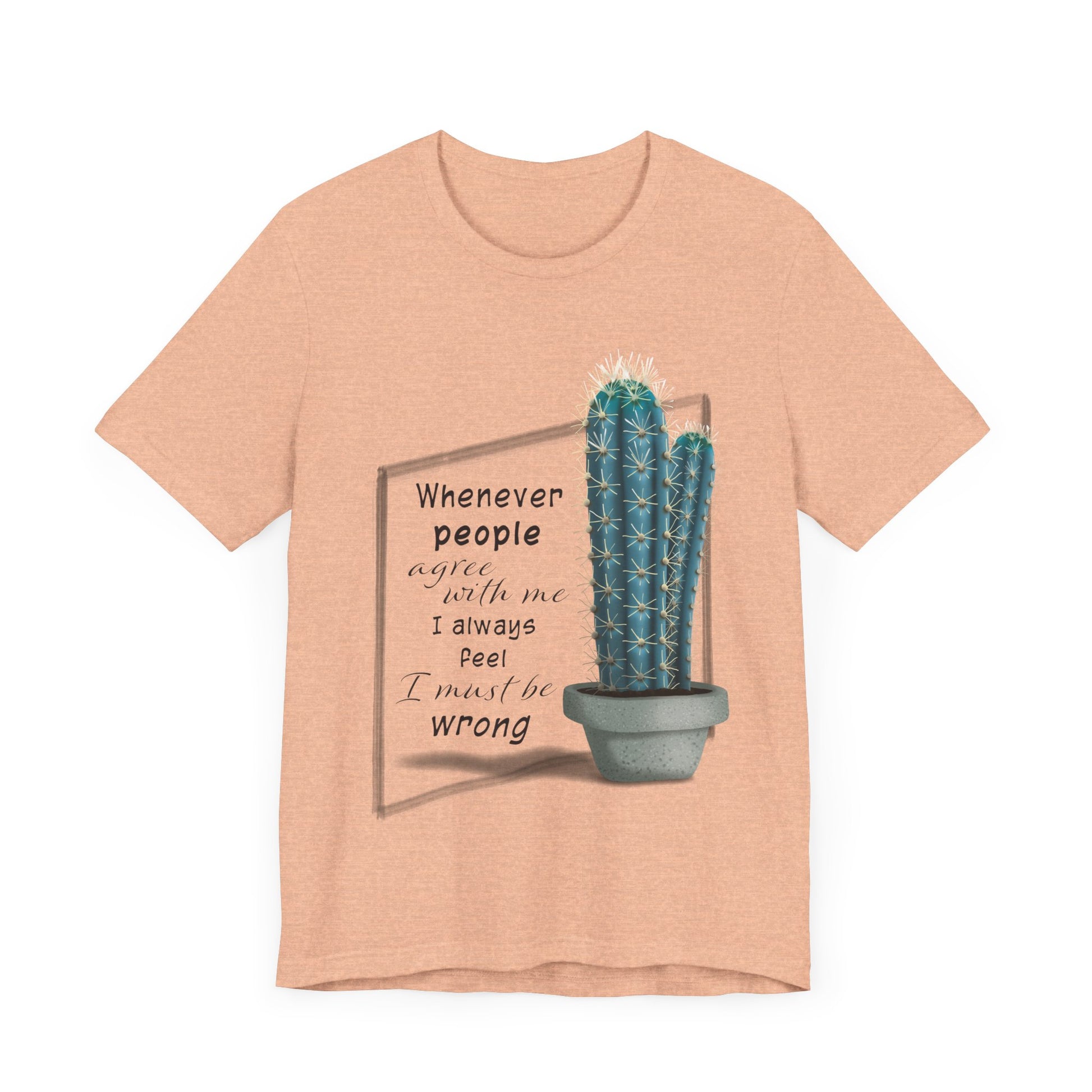 What did the first blue cactus say to the second one? - Whenever people agree with me I always feel I must be wrong. Hey, its funny when you are wearing the shirt! A delightful in house design featuring an Oscar Wilde quote, whether you choose the heather mauve or athletic heather gray T-shirt color, you will always be right!
